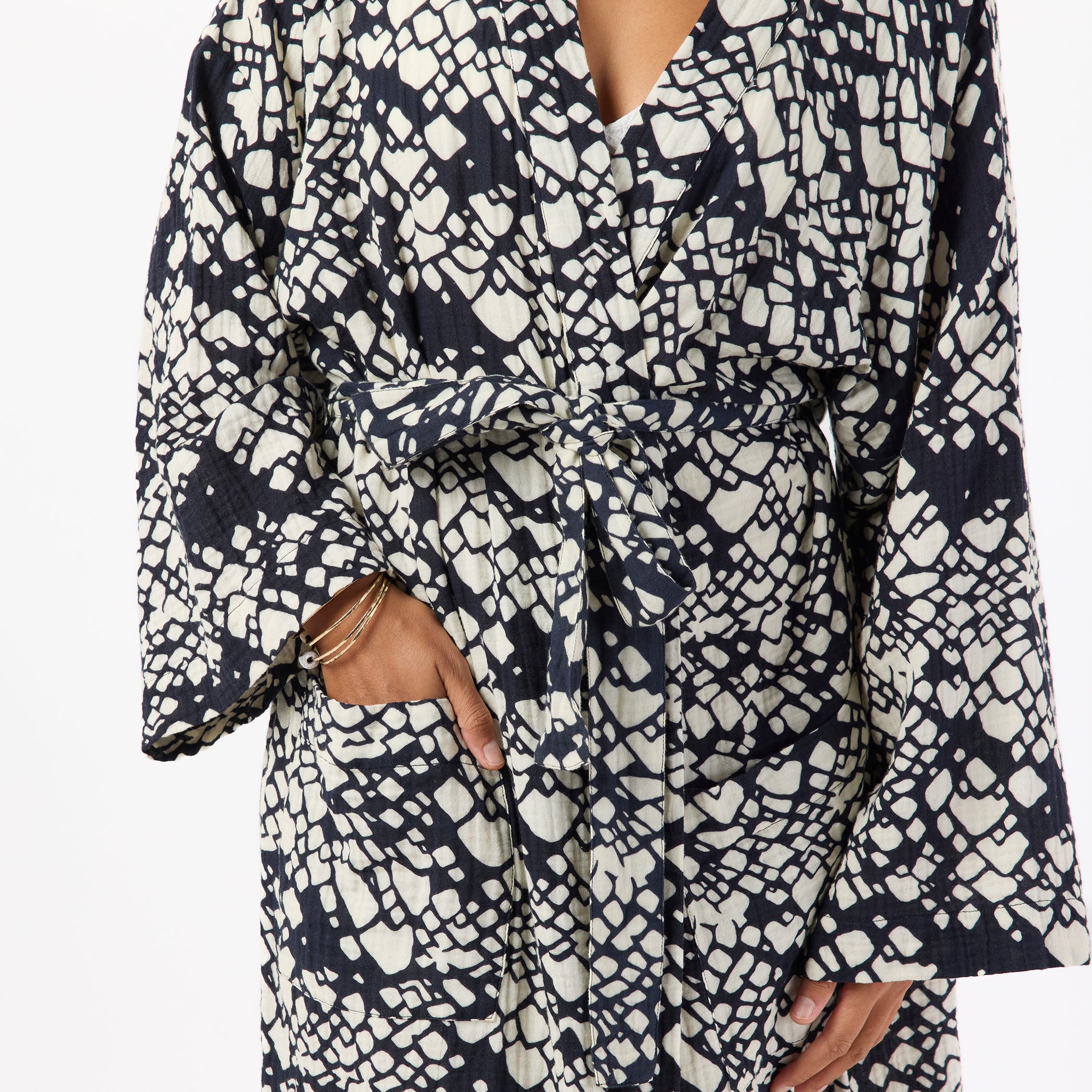Transform your home into a personal sanctuary with this lightweight robe. Features front pockets and an adjustable belt for a perfect fit. Lounge in style with the below-the-knee length, ideal for relaxing at home or enjoying a quiet morning in bed. This isn't just a robe, it's your daily dose of spa day bliss.