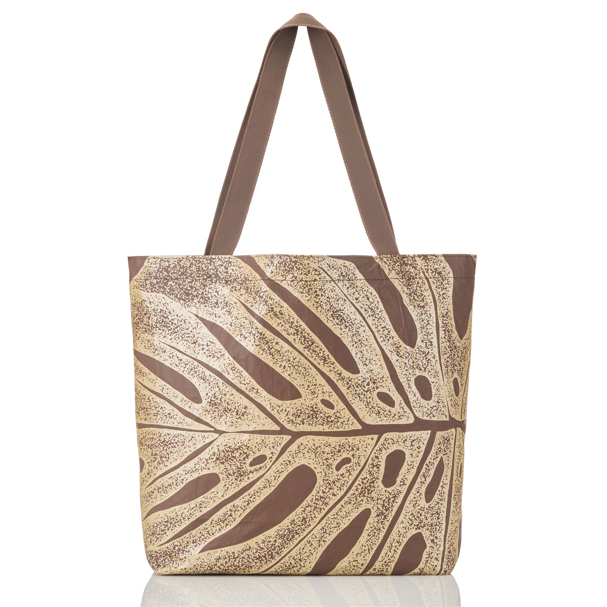 Deliciosa’s stipplled monstera leaf motif elvates chic neutral palette.