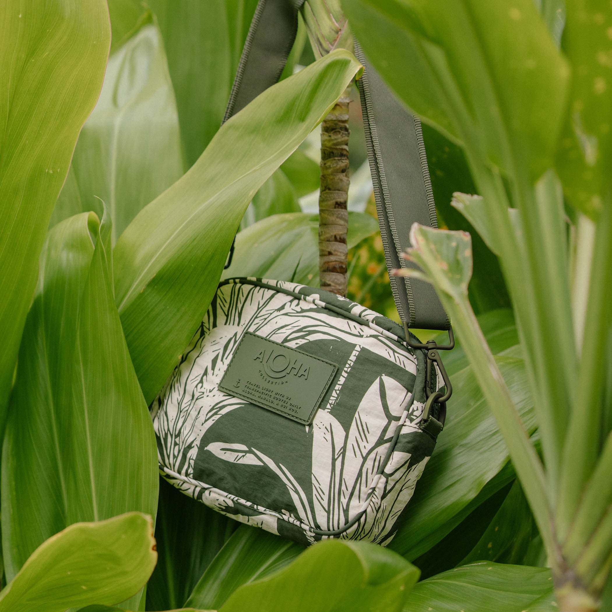 This print features bold, overlapping ti leaves evoking a sense of tropical warmth amidst autumn chill.